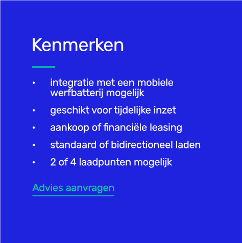 Ook leverbaar in bidirectionele uitvoering, waarbij de stroom niet alleen van het elektriciteitsnet naar het voertuig wordt geleid, maar ook andersom.